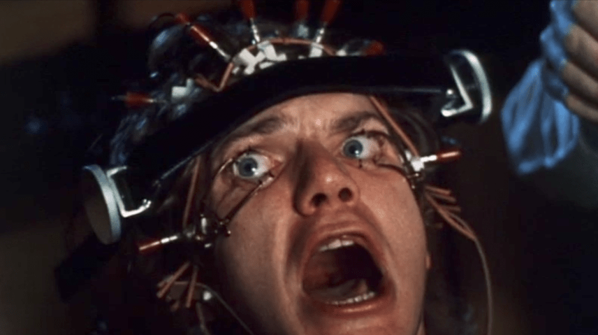 Le point de vue adopté par Stanley Kubrick est frontal, en plongée, proche du sujet, presque intrusif ; il place le spectateur dans la position de l’expérimentateur, observant les effets du traitement sur le cobaye humain. Les métaux argentés du dispositif apparaissent surexposés, ils s’imposent à la rétine et forment une extension monstrueuse du visage, tordu de douleur, du personnage.