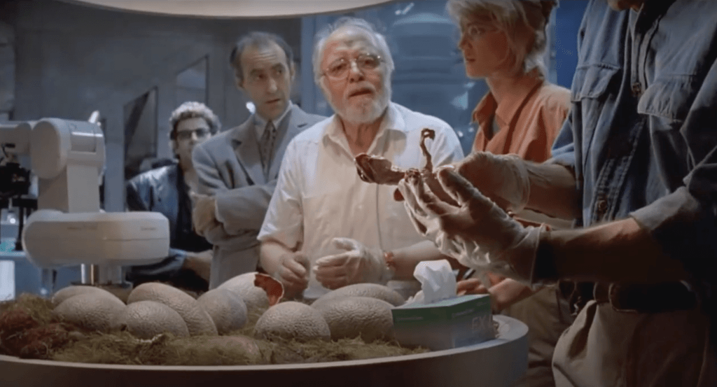 John Hammond occupe l’axe du plan : deux personnes se tiennent à sa gauche, deux autres à sa droite. Son regard, presque ému, est dirigé vers un bébé dinosaure fraîchement éclos. Autour de lui, les autres personnages arborent des expressions faciales davantage caractérisées par la stupéfaction et la crainte. La lumière douce du laboratoire accentue l’aspect presque sacré de cette naissance, à la fois promesse et menace.